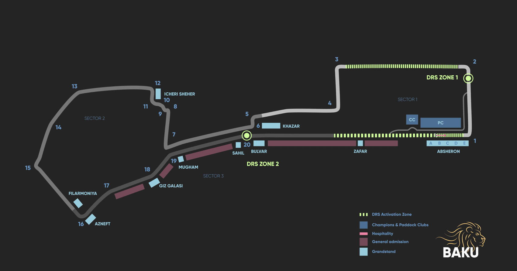 Do you want additional information about the Baku City Circuit? Download our free Circuit Guide for the Baku City Circuit. There is a map with facilities included. It’s useful when selecting tickets or preparing for your F1 trip.