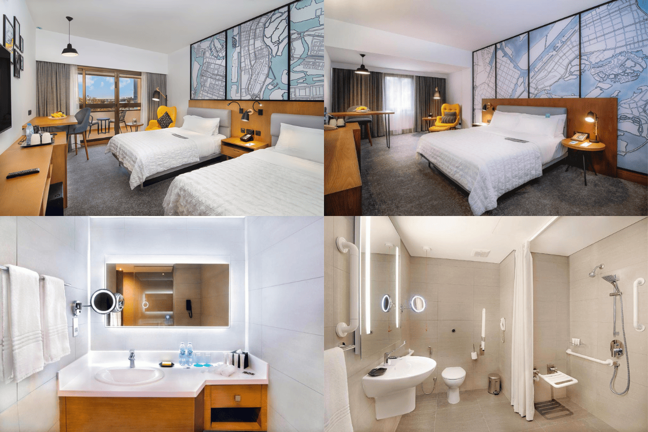 All spacious rooms have ensuite bathrooms, minibar, Flatscreen-tv, air-conditioning and free Wi-Fi. The hotel itself has multiple bars and restaurants for your comfort. There’s an outdoor pool and Fitness centre. Additionaly, the hotel even has a sports bar with pool and table tennis options for late night entertainment.