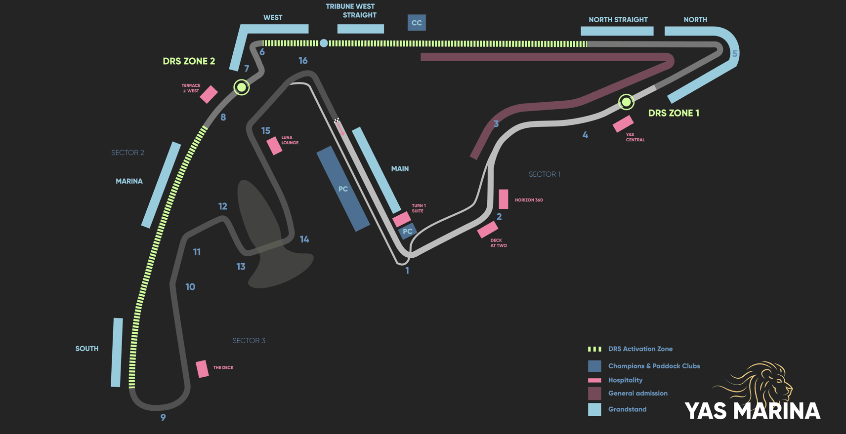 General Admission (at € 285, -), also called Abu Dhabi Hill, gives access to the General Admission areas as indicated on the circuit image (General Admission). Due to the sun (and no shade), the relatively high entrance fee and the limited view of the track, we generally do not recommend these tickets. If it fits within your budget, a grandstand seat is well worth the investment.
